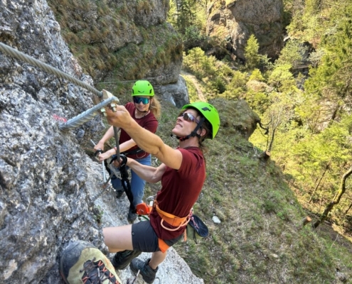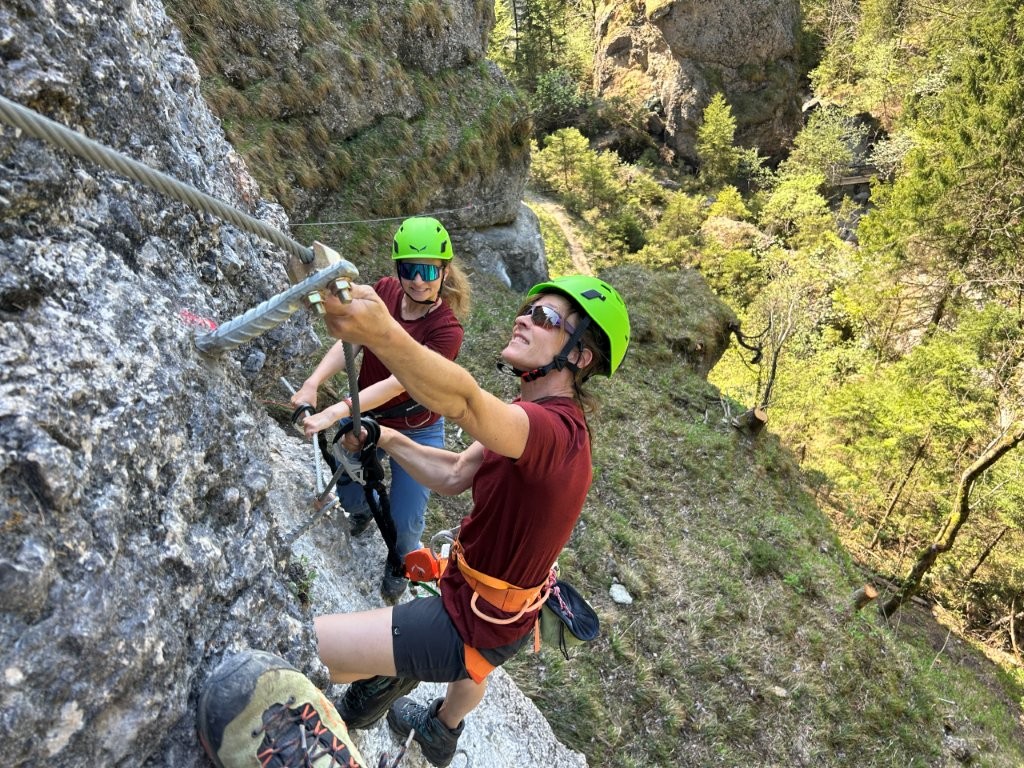 Der Kurs ist speziell für Einsteiger konzipiert. In lockerer Atmosphäre lernst du alles Wichtige, um dich sicher und selbstbewusst am Klettersteig zu bewegen.